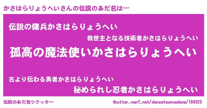 | 胡散臭い通販商品みたいなあだ名 | 『信頼と実績のサプリメント…その名も「かさはらりょうへい」』 |