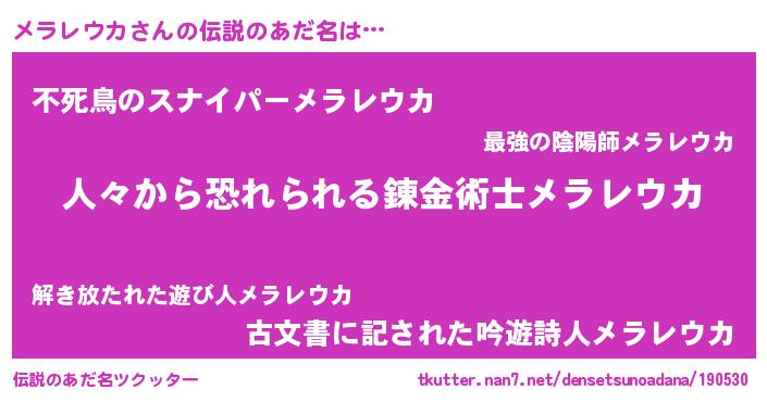 | ヘコむあだ名 | 『メラもー』『メラレウカ(笑)』 |