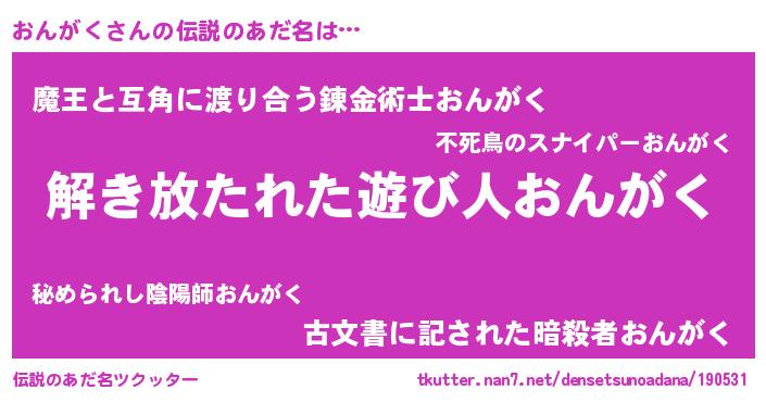 | 男性向けラノベタイトル風あだ名 | 『魔弾の王とおんがく』 |