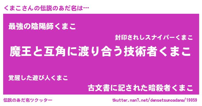 | 男性向けラノベタイトル風あだ名 | 『転生したらくまこだった件』 |