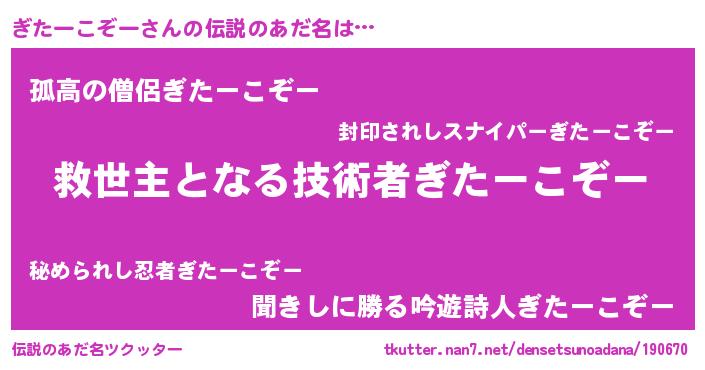 | 男性向けラノベタイトル風あだ名 | 『うちのぎたーこぞーが世界を掌握している!』 |