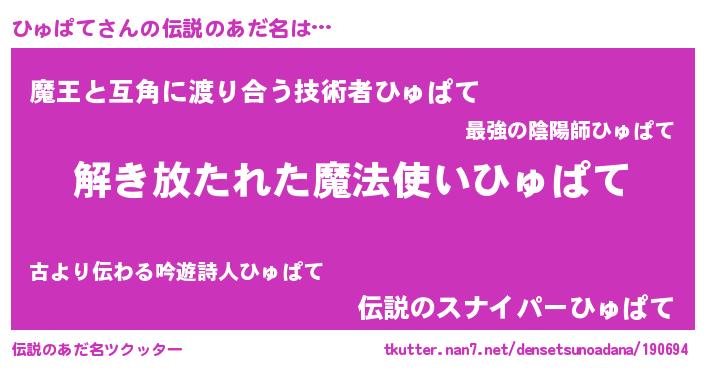 | 女子向けラノベタイトル風あだ名 | 『ひゅぱての卵を拾いまして』 |