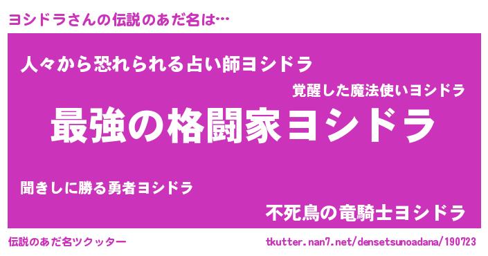 | 男性向けラノベタイトル風あだ名 | 『ヨシドラに滅ぼされるだけの簡単なお仕事です』 |