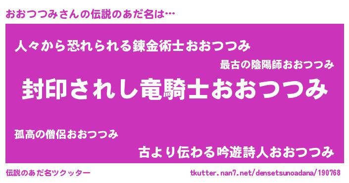 | 女子向けラノベタイトル風あだ名 | 『おおつつみストレイドッグス』 |