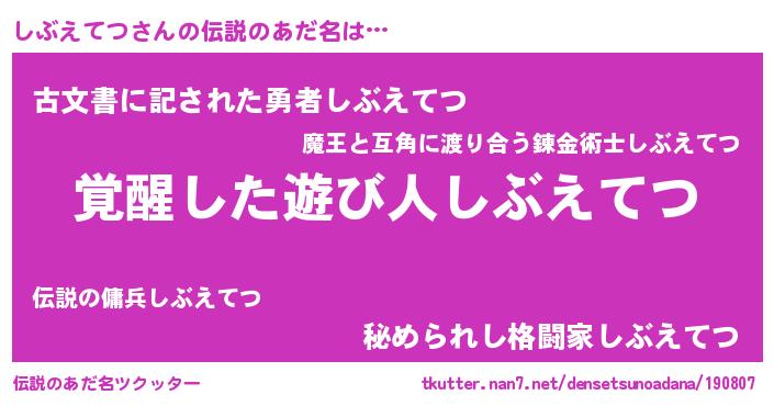 | 意味不明あだ名 | 『とにかく怪しいしぶえてつ』 |