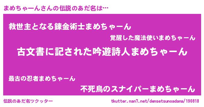 | 男性向けラノベタイトル風あだ名 | 『この素晴らしい世界にまめちゃーんを!』 |