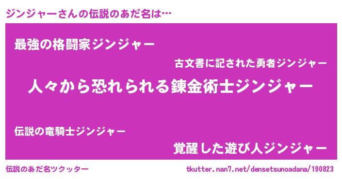 | ヒーロー風カッコイイあだ名 | 『正義の使者ジンジャー』『魔戒騎士ジン』 |