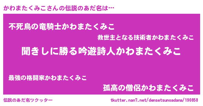 | 男性向けラノベタイトル風あだ名 | 『かわまたくみこという概念が存在しない退屈な世界 』 |