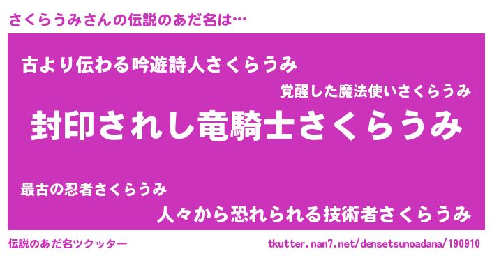 | ヒーロー風カッコイイあだ名 | 『最強戦士サクラウミ』『仮面サクダー』 |