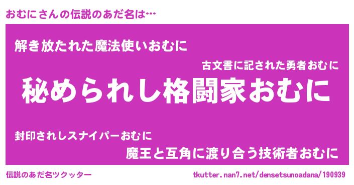 | 男性向けラノベタイトル風あだ名 | 『オムニスレイヤー』『魔弾の王とおむに』 |
