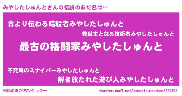 | 男性向けラノベタイトル風あだ名 | 『転生したらみやしたしゅんとだった件』 |