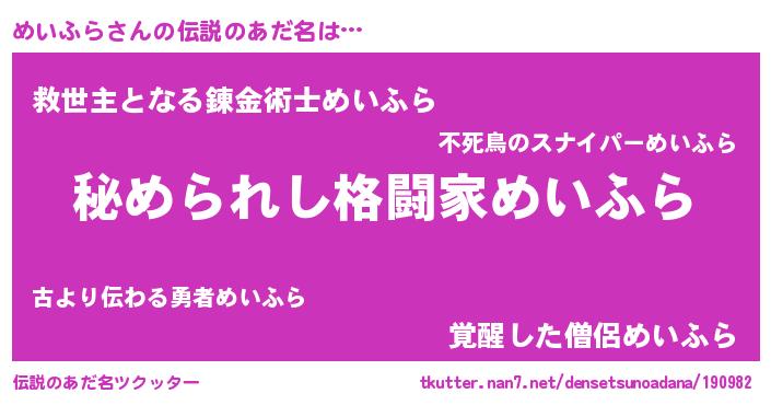 | 意味不明あだ名 | 『自称めいふら』『めいふらフォーエバー』 |