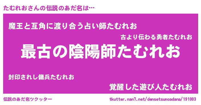 | 男性向けラノベタイトル風あだ名 | 『Re:たむれおから始める異世界生活』 |