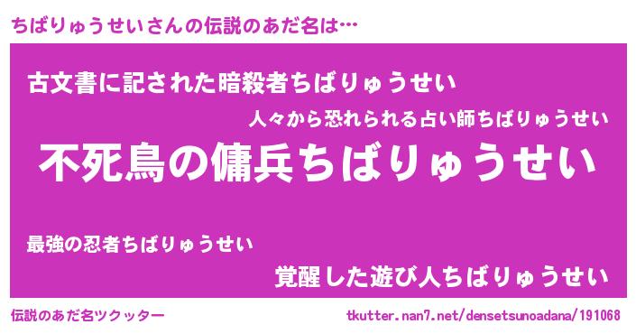 | ヒーロー風カッコイイあだ名 | 『仮面チバダー』『ネオチバリュウセイ』 |