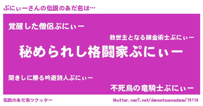 | 男性向けラノベタイトル風あだ名 | 『魔弾の王とぷにぃー』『ぷにぃーの憂鬱』 |