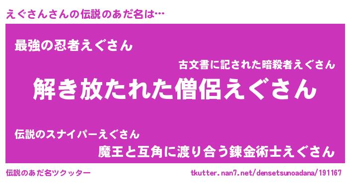 | ヒーロー風カッコイイあだ名 | 『仮面エグダー』『炎刃騎士エグ』 |