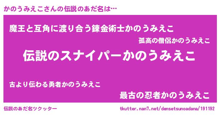 | ヒーロー風カッコイイあだ名 | 『仮面カノダー』『スーパーカノウミエコ』 |