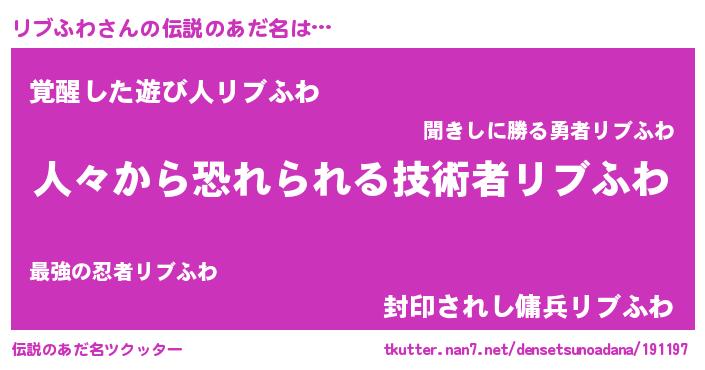 | ヒーロー風カッコイイあだ名 | 『正義の使者リブふわ』『天弓騎士リブ』 |