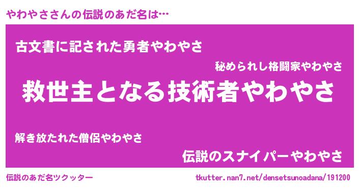 | ヒーロー風カッコイイあだ名 | 『慈愛の使者やわやさ』『ネオヤワヤサ』 |