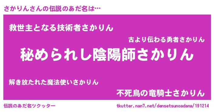 | 女子向けラノベタイトル風あだ名 | 『さかりんの雑貨屋さん』『闇のさかりん』 |
