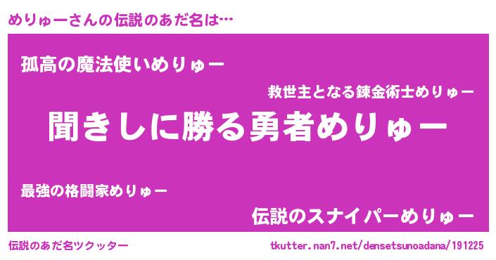 | 意味不明あだ名 | 『自称めりゅー』『永久保存めりゅー』 |