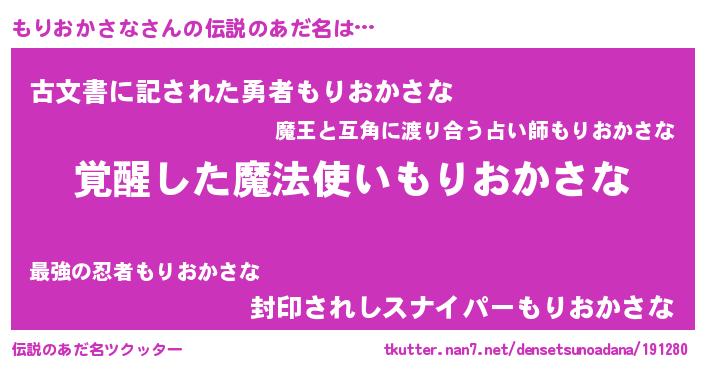 | 男性向けラノベタイトル風あだ名 | 『もりおかさなの嫁は女の子じゃないと思った?』 |