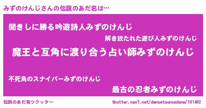 | ヒーロー風カッコイイあだ名 | 『仮面ミズダー』『愛の使者みずのけんじ』 |