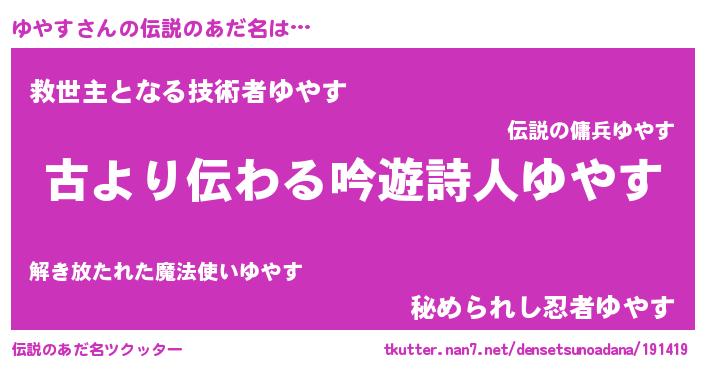 | 意味不明あだ名 | 『自称ゆやす』『永久保存ゆやす』 |