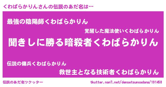 | 男性向けラノベタイトル風あだ名 | 『くわばらかりんという概念が存在しない退屈な世界 』 |
