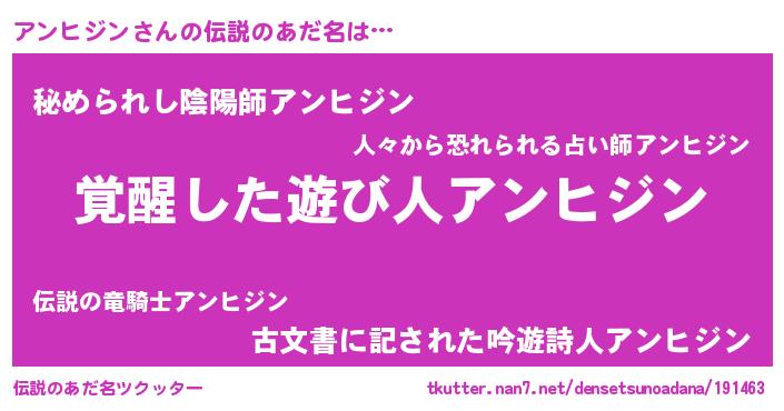 | 男性向けラノベタイトル風あだ名 | 『アンヒジン~年齢イコール彼女いない歴の魔法使い~』 |