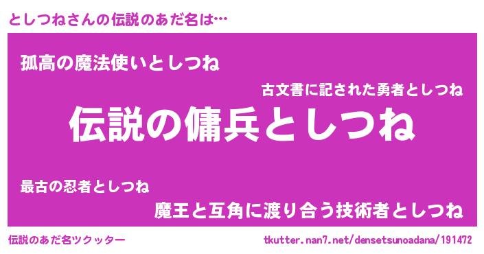 | 男性向けラノベタイトル風あだ名 | 『魔弾の王ととしつね』『としつねの憂鬱』 |