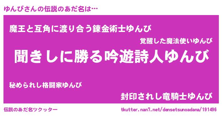 | 意味不明あだ名 | 『永久保存ゆんび』『自称ゆんび』 |