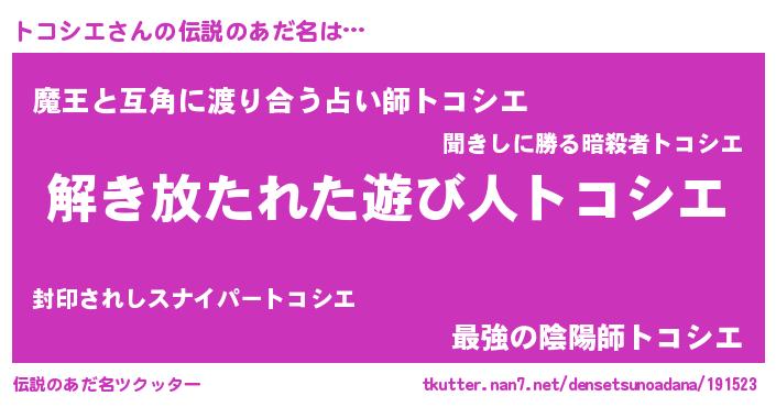 | 女子向けラノベタイトル風あだ名 | 『乙女ゲームの破滅フラグしかない悪役トコシエに転生してしまった…』 |