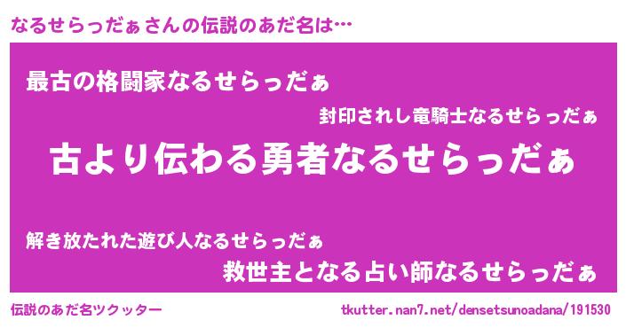| 胡散臭い通販商品みたいなあだ名 | 『来世でも幸せになれる水素水…その名も「なるせらっだぁ」』 |