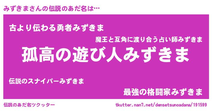 | ヒーロー風カッコイイあだ名 | 『暗黒騎士ミズ』『ウルトラ戦士ミズキマ』 |