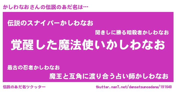 | ヒーロー風カッコイイあだ名 | 『天弓騎士カシ』『スーパーカシワナオ』 |