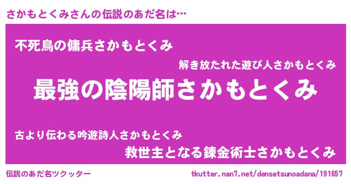 | 男性向けラノベタイトル風あだ名 | 『さかもとくみ~年齢イコール彼女いない歴の魔法使い~』 |