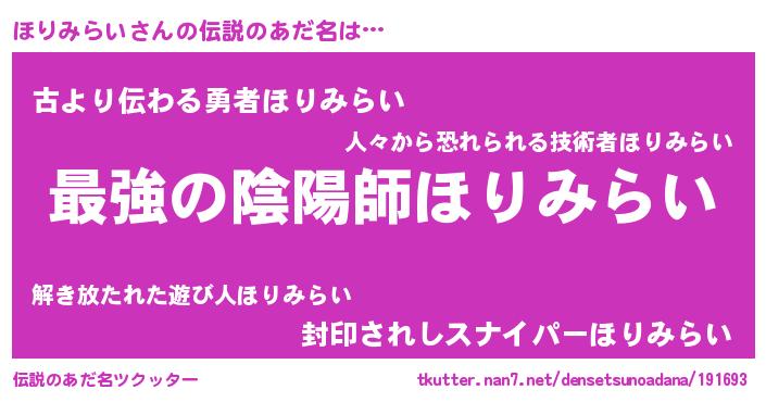 | 男性向けラノベタイトル風あだ名 | 『ほりみらいに滅ぼされるだけの簡単なお仕事です』 |