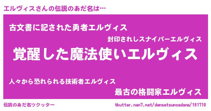 | ヒーロー風カッコイイあだ名 | 『究極戦士エルヴィス』『幻影騎士エル』 |
