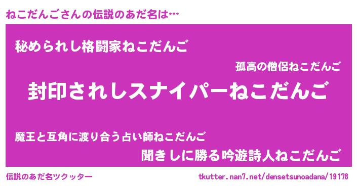 | 男性向けラノベタイトル風あだ名 | 『この素晴らしい世界にねこだんごを!』 |