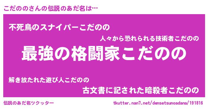 | 男性向けラノベタイトル風あだ名 | 『こだのの~年齢イコール彼女いない歴の魔法使い~』 |