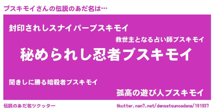 | 男性向けラノベタイトル風あだ名 | 『魔弾の王とブスキモイ』 |