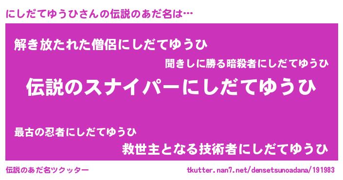 | 胡散臭い通販商品みたいなあだ名 | 『必ず成功する霊験あらたかなお札…その名も「にしだてゆうひ」』 |