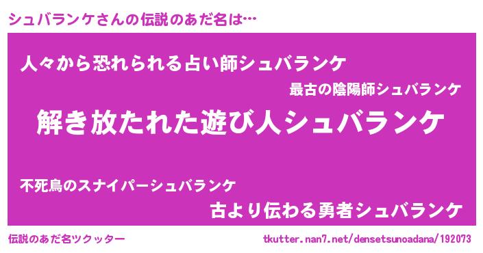 | 男性向けラノベタイトル風あだ名 | 『この素晴らしい世界にシュバランケを!』 |