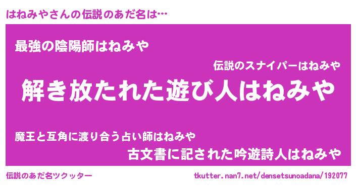 | 男性向けラノベタイトル風あだ名 | 『ダンジョンにはねみやを求めるのは間違っているだろうか』 |