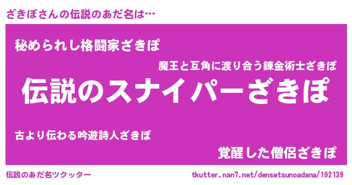 | 男性向けラノベタイトル風あだ名 | 『ざきぽの憂鬱』『魔法科高校のざきぽ』 |