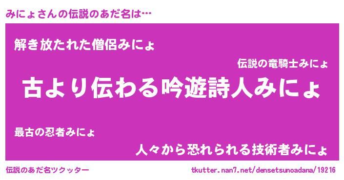 | 女子向けラノベタイトル風あだ名 | 『横柄みにょと宰相陛下』『闇のみにょ』 |