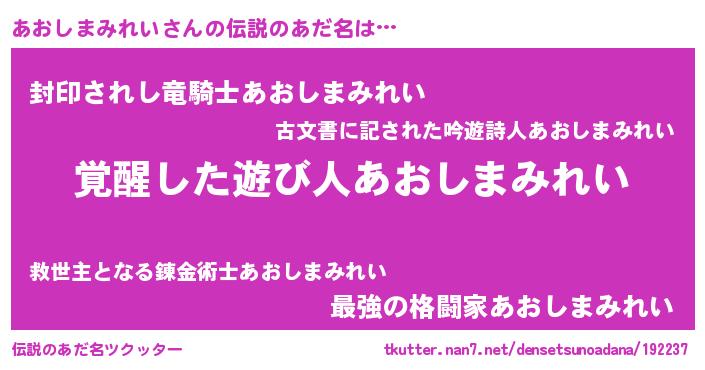| 男性向けラノベタイトル風あだ名 | 『あおしまみれいに滅ぼされるだけの簡単なお仕事です』 |