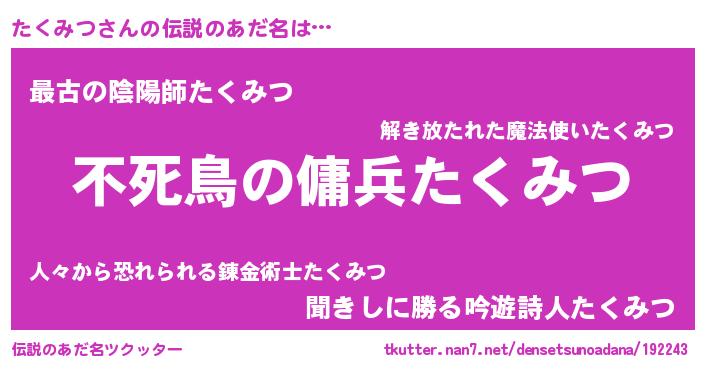 | ファンタジー風あだ名 | 『タクフェル』『エターナルタクミツー』 |