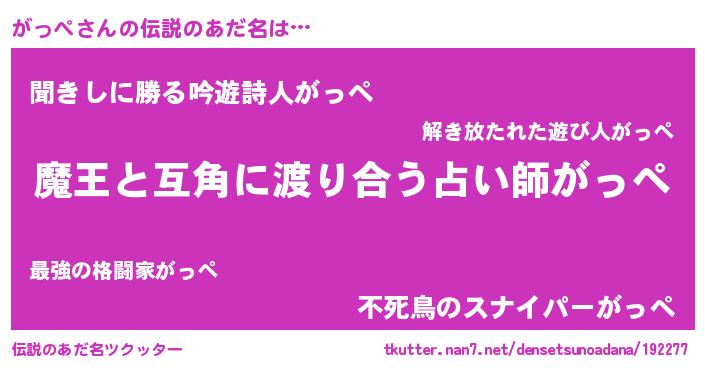 | 男性向けラノベタイトル風あだ名 | 『この素晴らしい世界にがっぺを!』 |